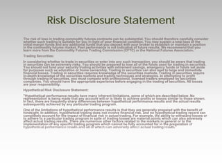 The document is a risk disclosure statement for commodity trading, emphasizing the substantial risks in trading futures and securities, and the responsibility of losses by the trader. It discusses managed futures managed by professional money managers and highlights their potential for diversification and various trading methods. Additionally, it presents an invitation to participate in an auto-execution trading program, requiring a minimum account size of $25,000.