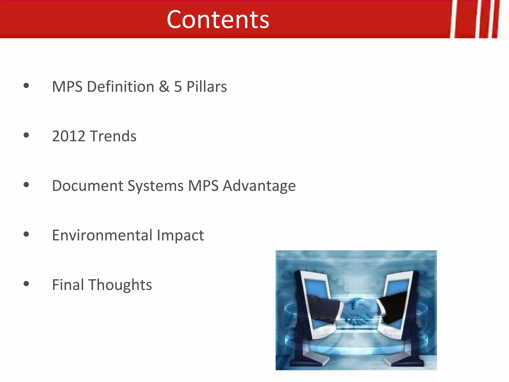The document discusses managed print services (MPS), which involves outsourcing management of an organization's printing fleet to a third party. The key benefits of MPS include cost control through ongoing optimization, proactive maintenance, consolidated billing, and freeing up IT resources. MPS follows five pillars: define, measure, analyze, improve, and control. Trends in the industry show more providers offering comprehensive MPS solutions to help customers simplify management of printing costs, which typically represent 1-3% of revenue. MPS can streamline workflows, improve productivity, and reduce environmental impacts from paper, toner, and energy use associated with printing.