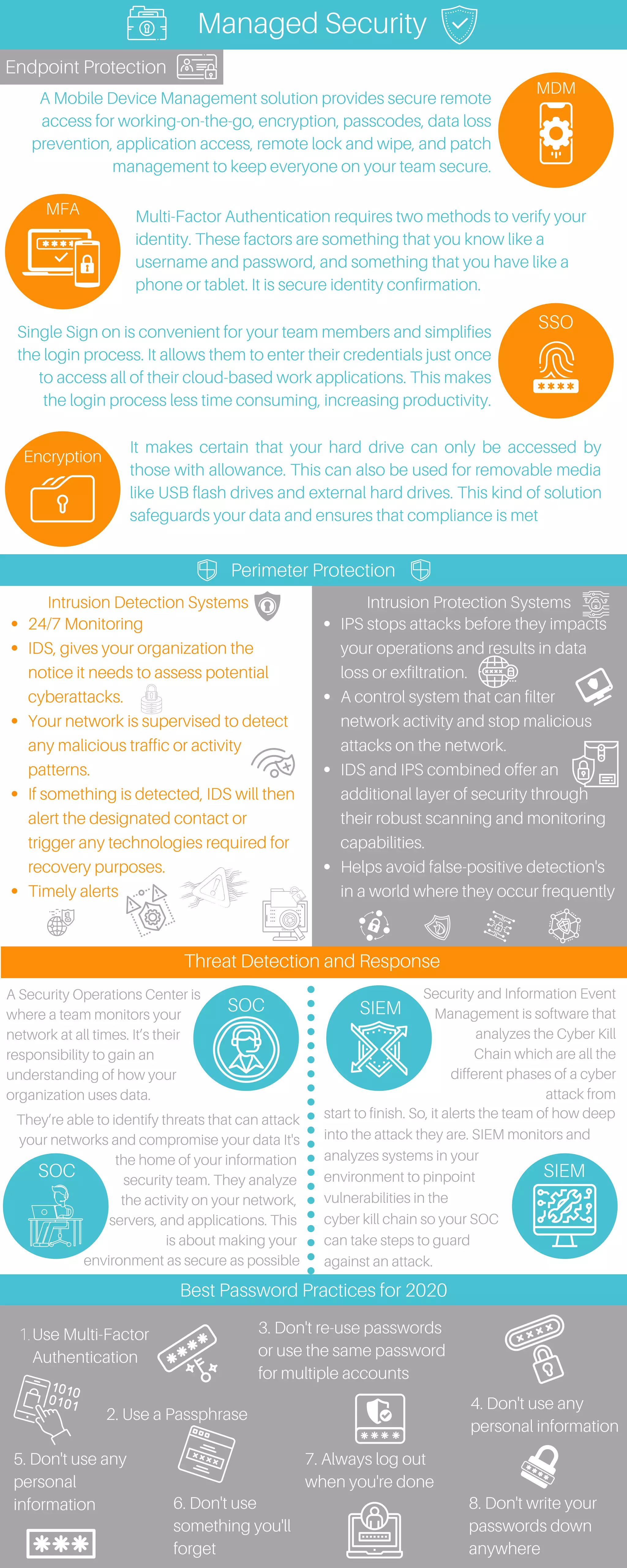 The document outlines the importance of intrusion prevention and detection systems (IPS/IDS) in safeguarding networks from cyberattacks, emphasizing their roles in monitoring, alerting, and analyzing malicious activity. It discusses the necessity of a security operations center (SOC) and security information event management (SIEM) tools to manage threats throughout the cyber kill chain, while also highlighting best practices in password security and multi-factor authentication. Additionally, it covers mobile device management and single sign-on solutions for secure, efficient access to organizational resources.