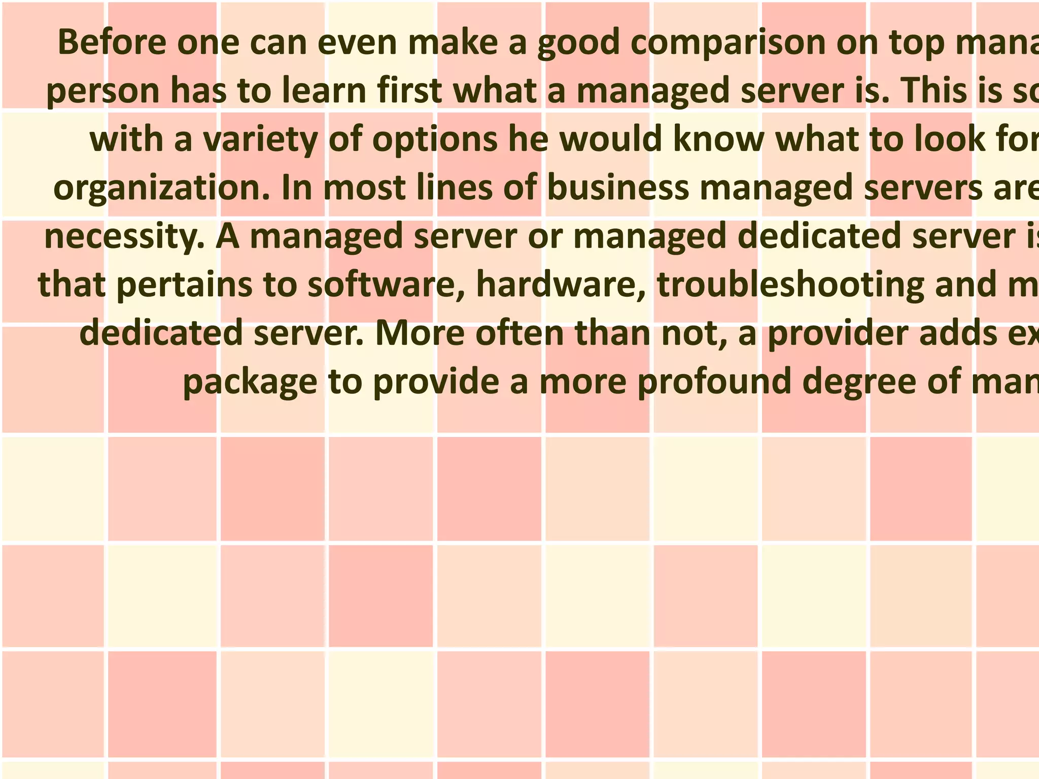 A managed server is a dedicated server that is maintained by an external provider, taking care of software, hardware, troubleshooting and maintenance. The top managed server providers are DedicatedNOW, SingleHop and RackSpace. Each provides fully managed servers with 24/7 support located in their own data centers. DedicatedNOW focuses on high quality infrastructure at low prices in Windows and Linux. SingleHop offers flexible options including a selection of managed hosting plans and the ability to customize services. RackSpace provides a dedicated support team to serve as an extension of the customer's business. The best managed server provider meets the specific needs of each organization.