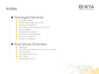 Ikya Group offers managed services for enhancing operational efficiencies in various sectors, helping businesses reduce costs and focus on core activities. Their expertise spans telecom, BFSI, e-commerce, and others, providing solutions like document management and service provisioning. Founded in 2007, Ikya has a national presence in India with a diverse clientele and a strong leadership team.