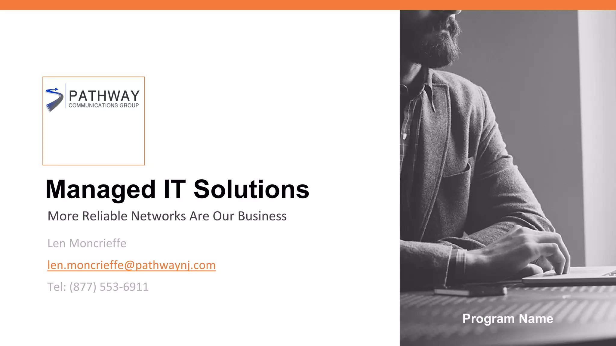 This document describes a managed IT solutions program offered by Pathway Communications Group. It discusses common IT challenges faced by businesses like unpredictable costs and downtime. It outlines the benefits of their fully managed support solution, which provides reliable networks and predictable costs through services like 24/7 monitoring, maintenance and support. Their approach aims to optimize systems, protect from security threats and align IT with business goals for improved productivity and reduced risks.