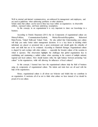 Organizational culture encompasses shared beliefs, values, and practices that influence how members behave within an organization. Managers play a crucial role in shaping this culture while also being influenced by it, which can affect their decision-making and interactions. Understanding organizational culture, including its components and how it interacts with broader societal cultures, is essential for effective leadership and talent management.