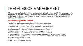 1. Frederick Taylor's Scientific Management Theory focused on improving economic efficiency through time and motion studies, training workers in improved methods, and linking pay to productivity.