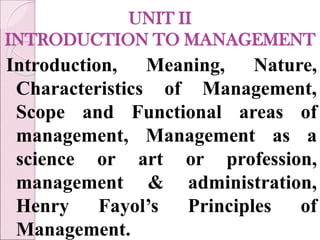 This document presents an extensive overview of management principles, including definitions, characteristics, and the importance of management in organizations. It highlights various functional areas such as financial, human resource, and production management, along with classical and administrative management views. Key figures like F.W. Taylor and Henry Fayol are referenced to illustrate foundational concepts in management theory and practice.
