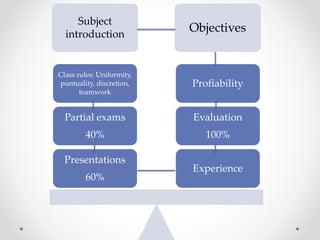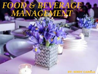 This document appears to be a syllabus for a Food & Beverage Management course. The 3-sentence summary is: The syllabus outlines the objectives, rules, and evaluation breakdown of the course, which includes concepts like resource optimization, profit and cost analysis, and business planning. Students will be evaluated based on presentations (60%) and partial exams (40%). The document also provides definitions and diagrams explaining key concepts in food and beverage management, such as the management skills pyramid and stakeholders in the industry.