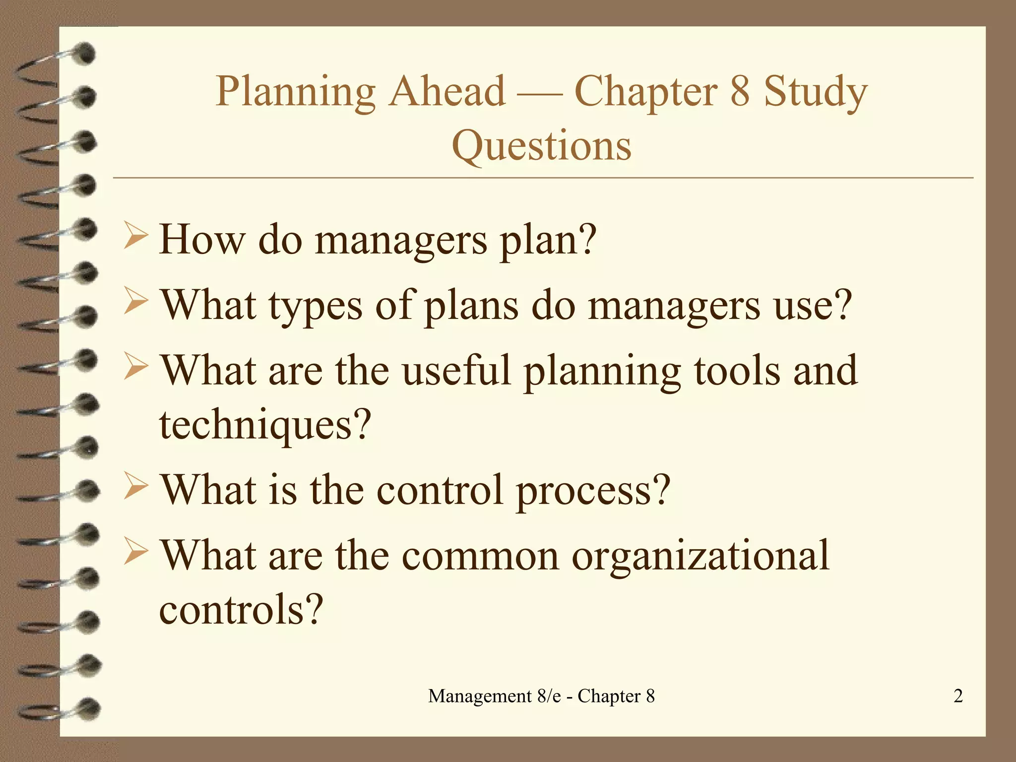 The presentation discusses how managers plan through defining objectives, determining current status, analyzing alternatives, and implementing and evaluating plans. It also examines different types of plans managers use, such as strategic, operational, and single-use plans. Useful planning tools covered include forecasting, contingency planning, scenario planning, and benchmarking. The control process and common controls like management by objectives and employee discipline systems are also summarized.
