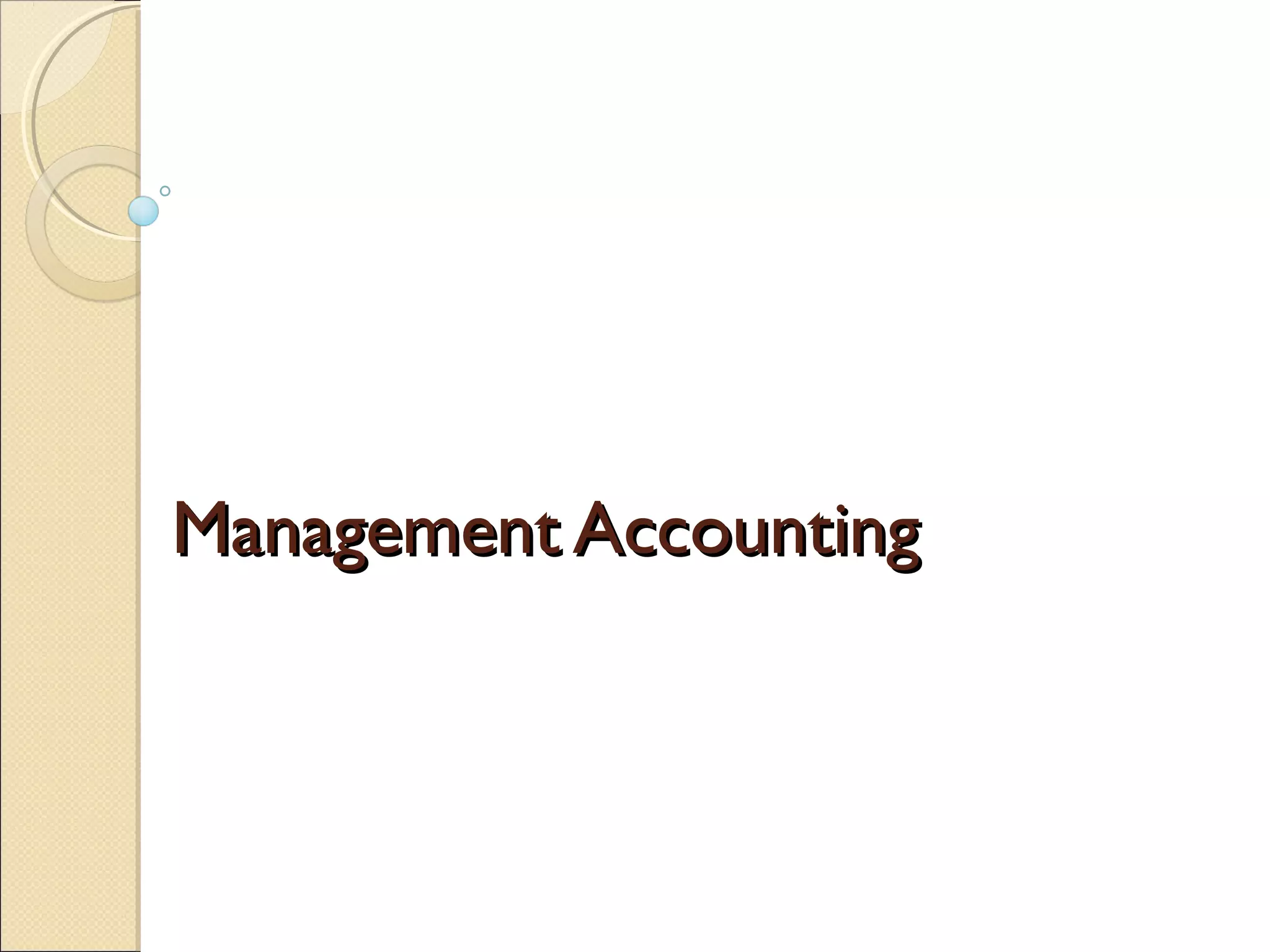 Management accounting provides information to management for planning, controlling, and decision making. It involves identifying, measuring, accumulating, analyzing, preparing, interpreting and communicating financial information. Management accounting also includes preparing financial reports for external stakeholders. Cost accounting is a key part of management accounting and involves determining and tracking the costs of products, services, activities or resources.