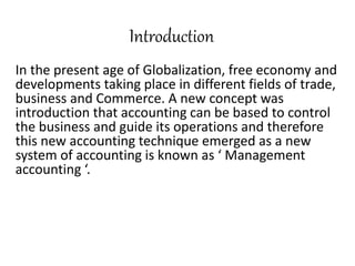 This document discusses management accounting and break-even analysis. It defines management accounting as accounting that enables efficient business operations through collecting and communicating internal information for management decision making. The document outlines the functions of management accounting as including data recording, interpretation, communication, planning, organizing, controlling, and decision making. It then provides an example break-even analysis problem calculating the break-even point in rupees and units, profit-volume ratio, margin of safety, and how these change with variations in selling price, fixed costs, and variable costs. The example problem is worked through in detail across 10 parts to demonstrate different aspects of break-even analysis.