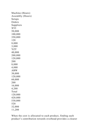 The document compares absorption costing and activity-based costing, detailing their methodologies and impacts on budgeted profit statements. It highlights that absorption costing allocates overheads uniformly, potentially obscuring product profitability, while activity-based costing provides clearer insights by linking costs to specific activities. The analysis reveals significant differences in profit contributions among products, with activity-based costing saving costs and highlighting previously unnoticed losses.