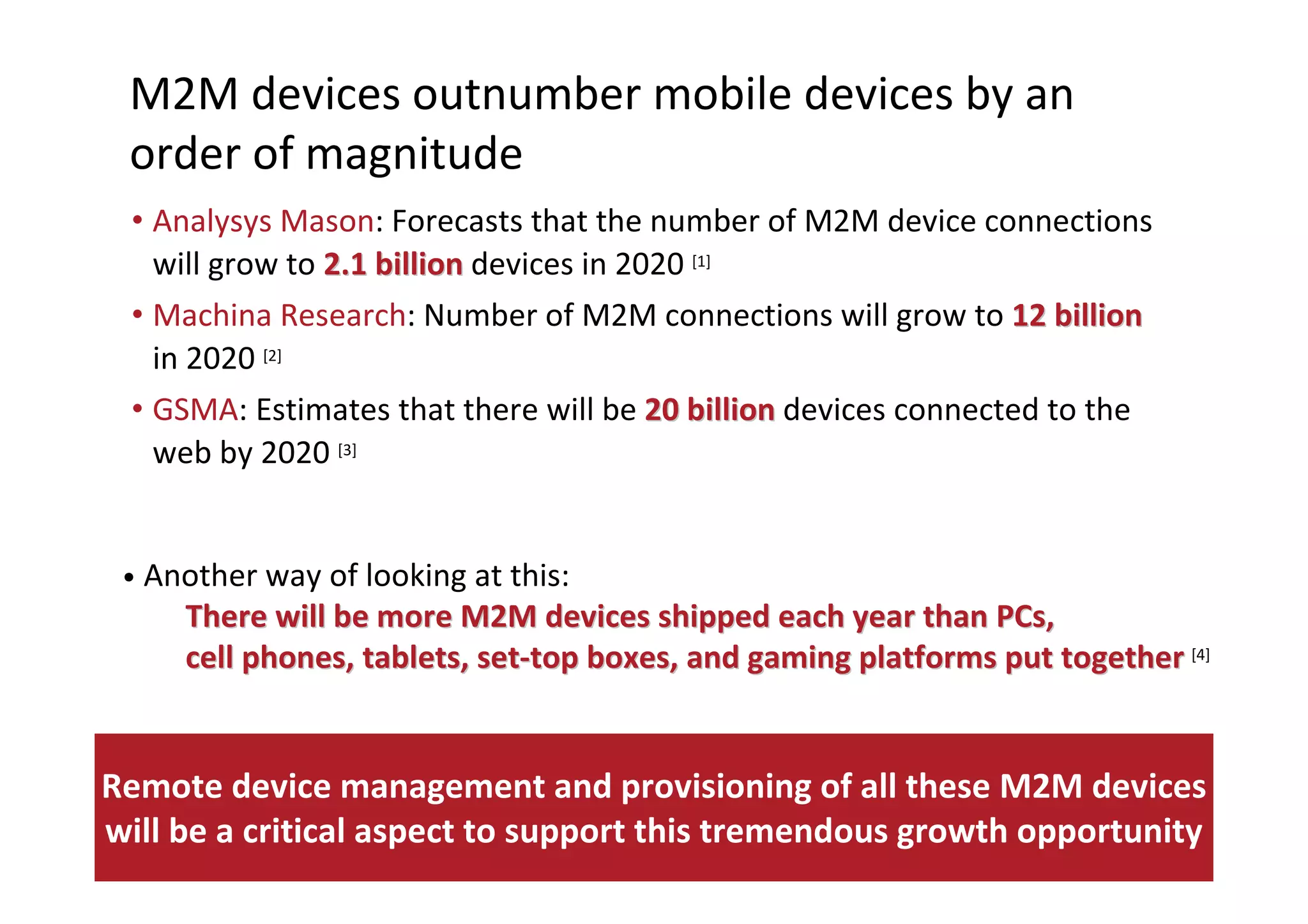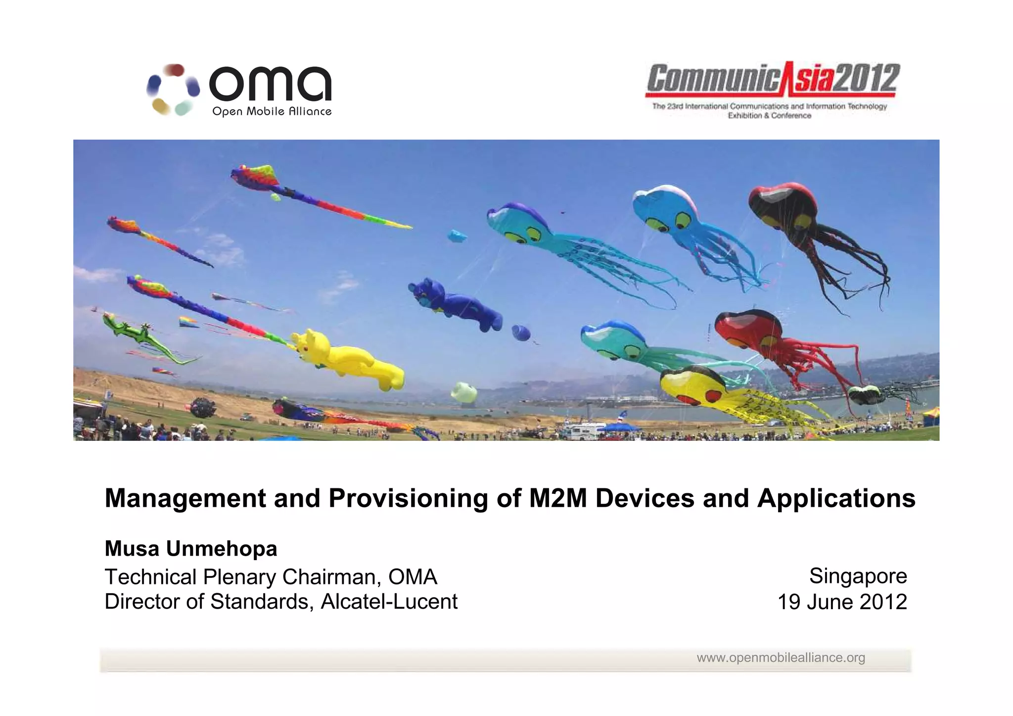 The document discusses the management and provisioning of machine-to-machine (M2M) devices, anticipating significant growth in connections, predicting up to 20 billion by 2020. It highlights the need for technological evolution in device management to accommodate diverse networks and M2M devices, including the introduction of various management protocols and frameworks. Additionally, it describes collaborative efforts within the industry, including partnerships with organizations like onem2m to enhance M2M capabilities and support service integration.