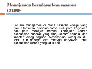 Manajemen berdasarkan sasaran (MBO) adalah sistem manajemen di mana karyawan dan manajer menetapkan sasaran kinerja bersama, kemajuan ditinjau secara berkala, dan imbalan diberikan berdasarkan pencapaian sasaran. MBO bertujuan untuk menyelaraskan tujuan manajemen dengan staf melalui proses penetapan sasaran bersama. Langkah-langkah MBO meliputi penetapan sasaran organisasi, departemen, individu, ren