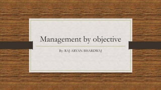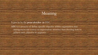 Management by objective (MBO) is a process defined by Peter Drucker in 1954 where specific objectives are set within an organization and communicated to employees. The process involves 1) setting organizational goals, 2) establishing employee goals and deciding how they will achieve objectives, 3) monitoring progress, 4) evaluating performance, and 5) rewarding employees. Regular evaluation and monitoring of employee progress is important for the effectiveness of MBO in providing structure and additional performance.