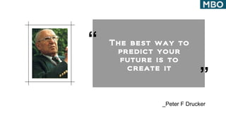 Management by Objectives (MBO) is a process whereby employees set objectives that are agreed upon with superiors and aligned with organizational goals. The core concept of MBO is planning so that organizations and employees are proactive rather than reactive. MBO requires employees to set measurable personal goals based on organizational goals, which are monitored by managers and rewarded upon achievement. The MBO process involves determining organizational objectives, translating them to employees, stimulating employee participation, monitoring progress, and evaluating and rewarding achievements.