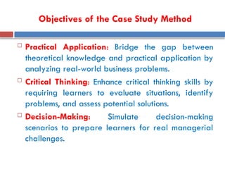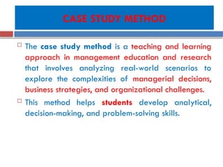 The case study method is an educational approach that analyzes real-world business challenges to enhance students' analytical and decision-making skills. It emphasizes bridging theory with practice, developing critical thinking, and fostering collaboration among learners. An example case study on 'Retail Bliss' highlights key management challenges faced by a declining retail chain and suggests strategies for turnaround, including enhancing digital presence and operational efficiency.