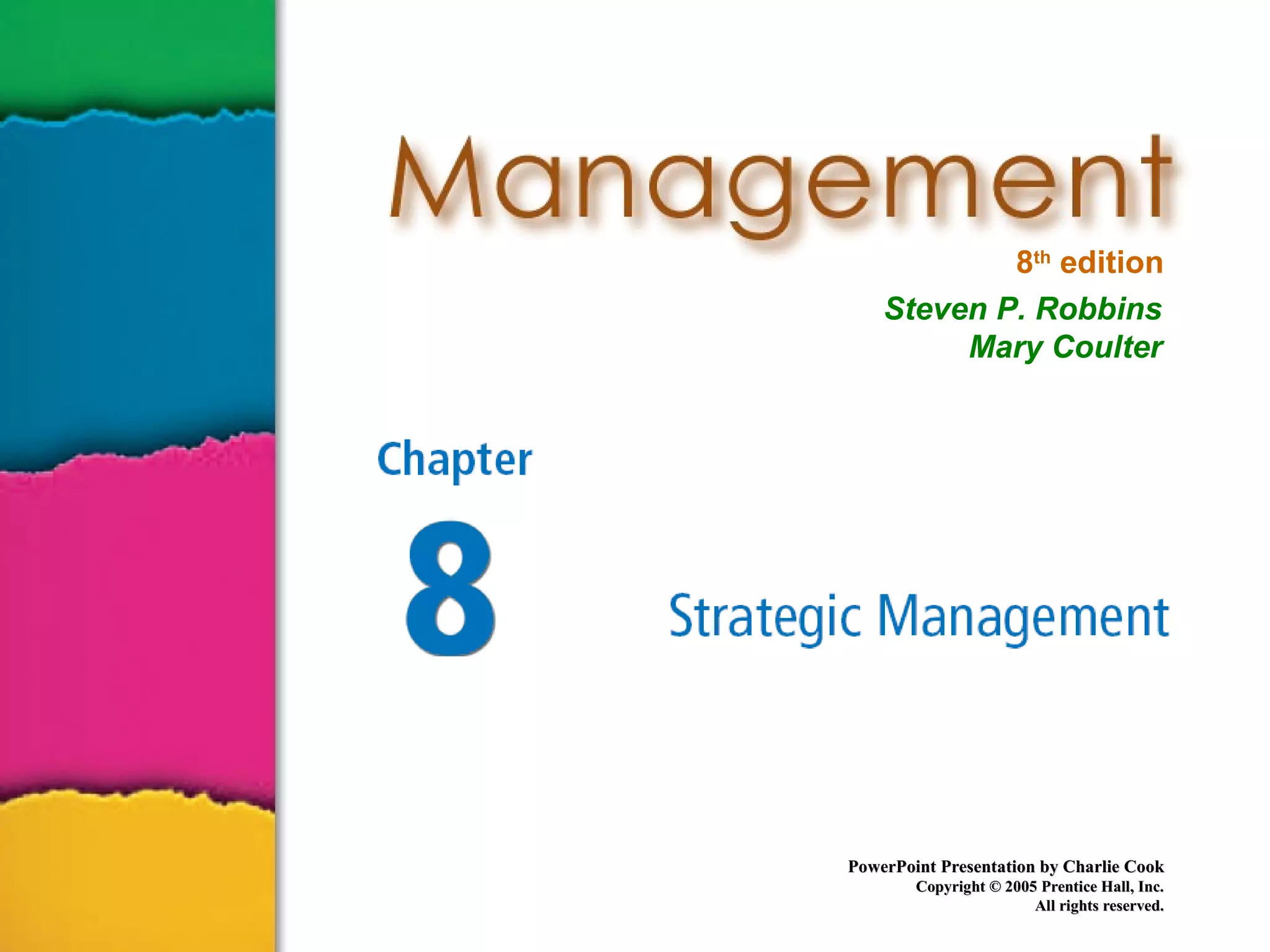 The document is a learning outline for a chapter on strategic management. It summarizes the key topics in the chapter, including defining strategic management, the six steps in the strategic management process, types of organizational strategies like growth, stability and renewal strategies, and how strategies must adapt to todays dynamic environment with e-business, customer focus, and innovation.