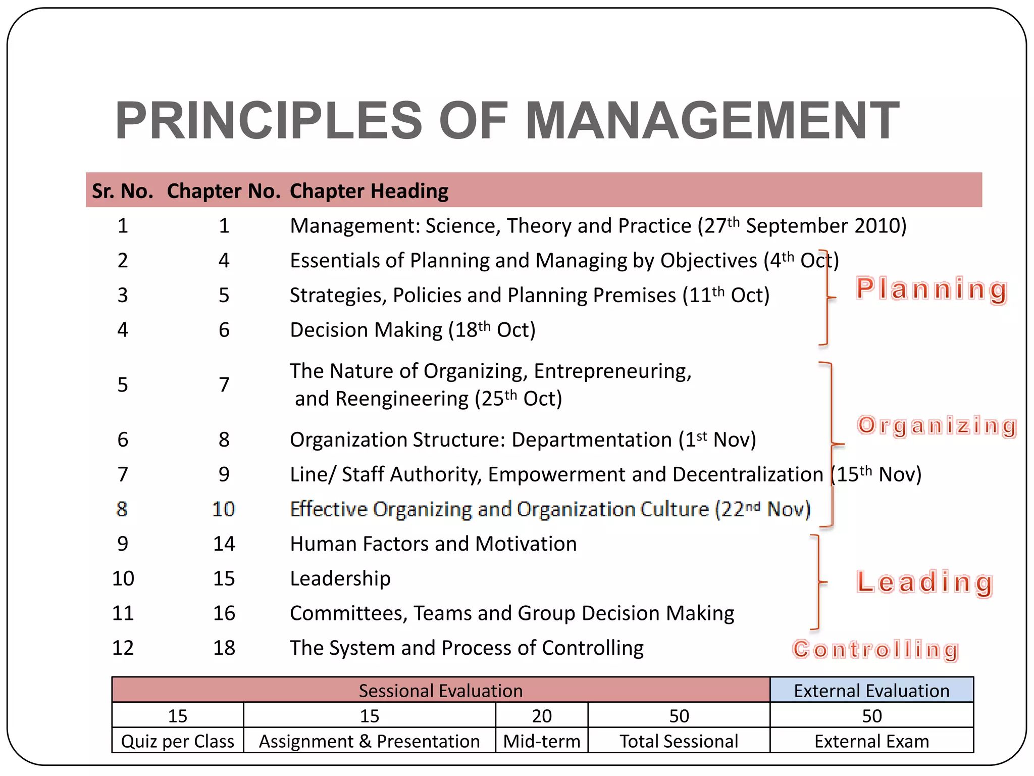 This document discusses principles of management including planning, organizing, leading, and controlling. It provides details on organizing such as avoiding mistakes through planning, ensuring flexibility, making staff effective, avoiding conflicts through clarification, and promoting an appropriate organization culture. Key topics covered include organization charts, position descriptions, the informal grapevine communication channel, and how leadership influences organizational culture through the values they promote.