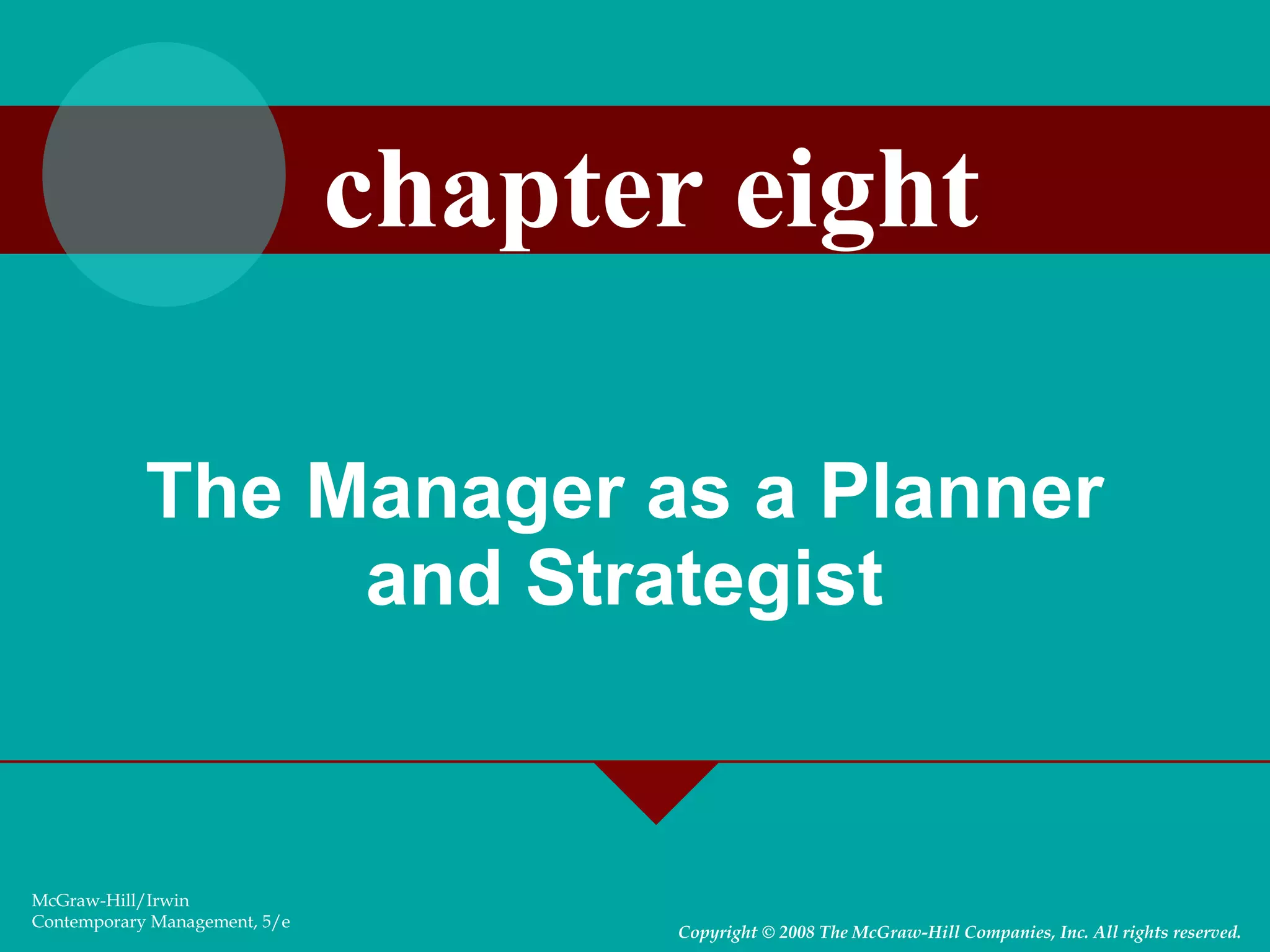 The document summarizes key concepts about planning and strategy from a management textbook chapter. It discusses the three main steps in the planning process: determining the organization's mission and goals, formulating strategy, and implementing strategy. It also describes different levels of planning, types of strategies including business-level strategies and corporate-level strategies, and strategic analysis tools like the five forces framework and SWOT analysis.