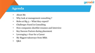 The document provides an overview of a career conversation on management consulting. It discusses why people pursue careers in consulting, the typical roles and expectations at major consulting firms, key challenges, how companies evaluate resumes and interviews, factors for success during placements, leveraging an MBA, and preparation tips. The document outlines the typical career progression from associate to partner and highlights problem solving, communication, and fit as important skills evaluated during interviews.