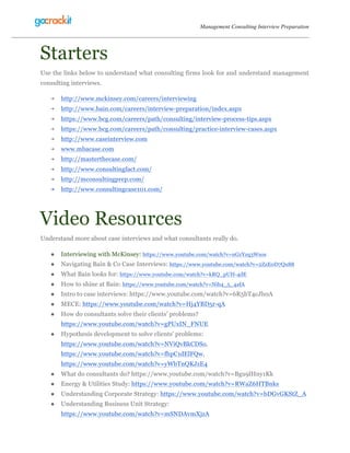 This document provides resources for preparing for management consulting interviews. It includes links to major consulting firm websites that describe the interview process. It also lists video resources that explain case interviews, consulting work, and example case studies. Sample consulting case studies and frameworks are available through various guides. Practice cases with video solutions are referenced to allow practicing the cases. Common "fit" interview questions are also included with links to explanations and mistakes to avoid. The goal is to understand the interview process and gain experience practicing sample cases to prepare for management consulting roles.