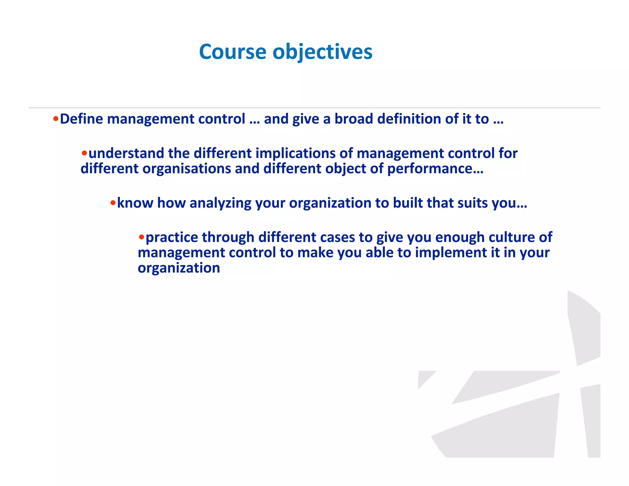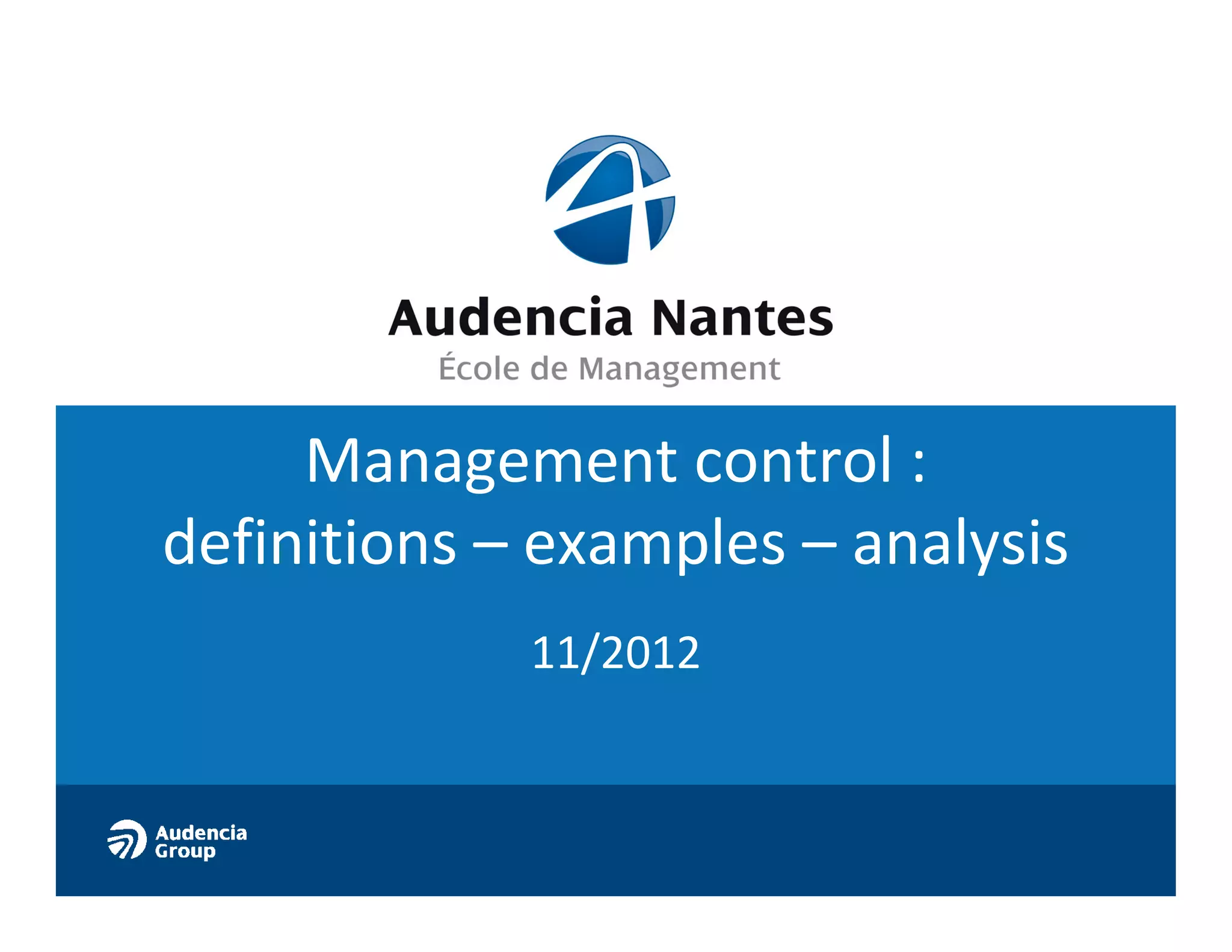 The document discusses management control and organizational issues. It addresses how management control systems can help coordinate decentralized organizations with different sub-units, decision levels, processes, and goals. It provides examples of how budgeting can coordinate business plans across various functions. It also examines the organizational positioning of management control and discusses the advantages and disadvantages of different positions such as being part of the CFO's office, an independent management control office, or embedded within business units. The case of Leroy Merlin, a large home improvement retailer, is presented to discuss how management control systems can enable coordination in a decentralized organization.