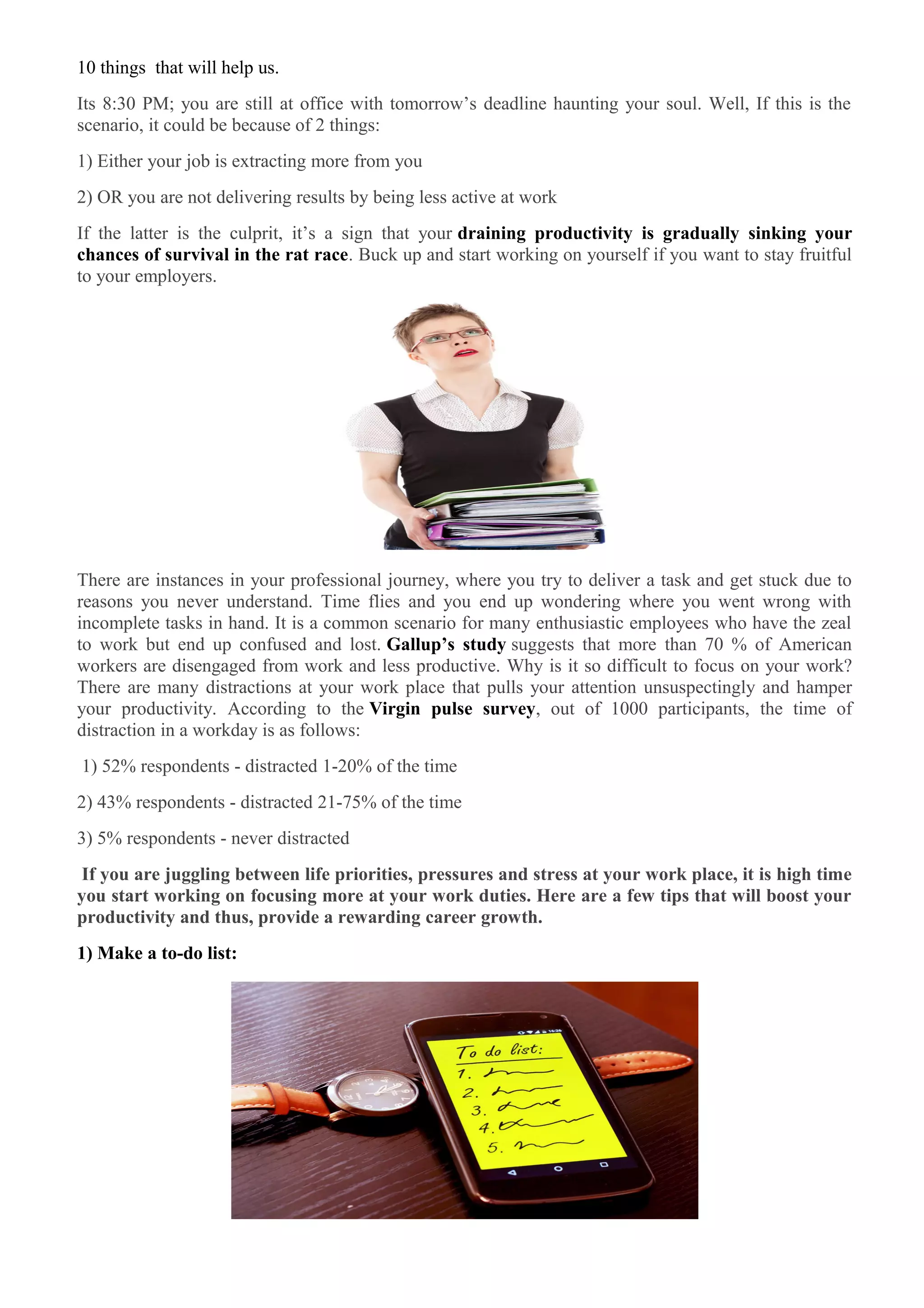 This document provides 10 tips to help improve productivity and focus at work: 1) Make a to-do list each morning to stay organized on tasks. 2) De-clutter your work area to reduce distractions. 3) Use a timer to better manage your time and focus. 4) Ensure you have an ergonomic chair and workstation to avoid physical discomfort. 5) Keep personal problems separate from work to maintain efficiency. 6) Avoid gossiping and distractions from social media to focus on tasks. 7) Stop multitasking and focus on one project at a time. 8) Work during your prime hours for better concentration. 9) Take short breaks to refocus if your prime hours pass. 10) Remember