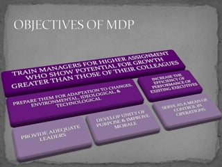 Development aims to enhance one's ability to understand and interpret knowledge, and results from experience and maturity. It differs from training, which focuses on learning specific behaviors and actions. Management development involves imparting knowledge, changing attitudes, or increasing skills to improve current or future management performance. It has a long-term focus on understanding knowledge, developing judgment, and expanding capacities, while training has a short-term focus on improving specific skills for a current job. Development measures effectiveness through having qualified people available when needed, promoting from within, and gaining a human resource competitive advantage.