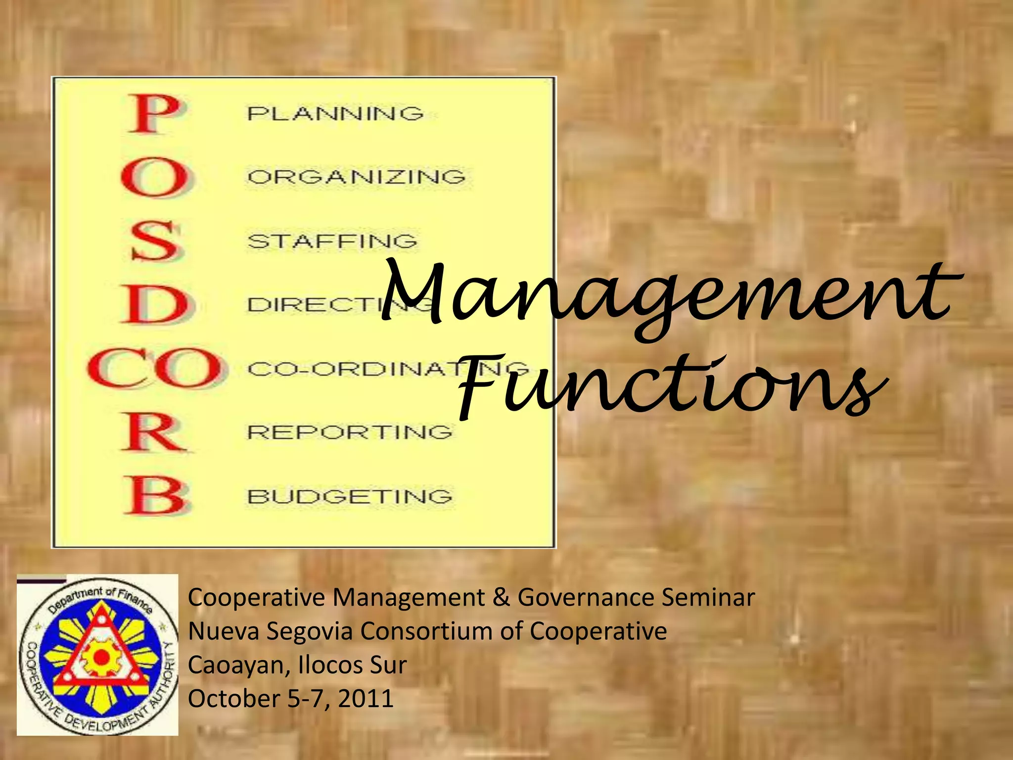 The document discusses management functions and the POSDCORB model. It defines POSDCORB as an acronym created by Luther Gulick comprising the main functions of management: Planning, Organizing, Staffing, Directing, Coordinating, Reporting, and Budgeting. It then explains each function in the POSDCORB model and the different levels of management, including their typical responsibilities.