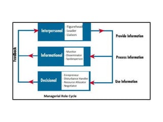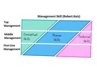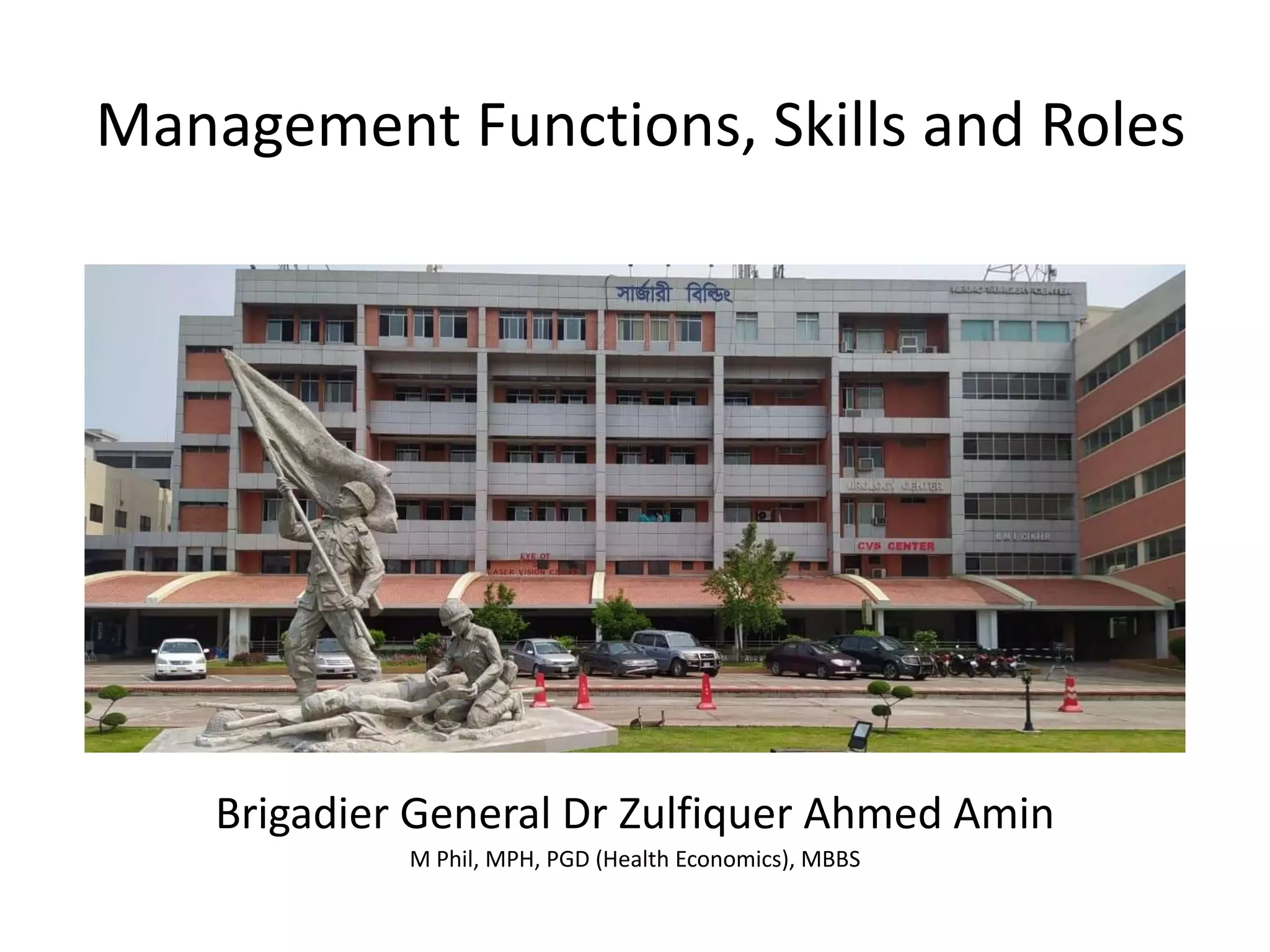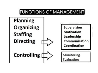 This document discusses management functions, skills, roles and attributes of good healthcare managers. It defines management as getting things done through people, and outlines key functions like planning, organizing, staffing, directing, controlling. It describes different types of plans, organization structures, and skills including conceptual, human and technical. Managerial roles are categorized as interpersonal, information processing and decision making. Attributes of good healthcare managers are discussed at personal, professional, institutional and psychological levels. The conclusion emphasizes that hospital management requires assimilating these concepts and skills to ensure patient satisfaction and organizational success.