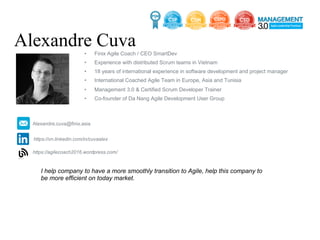 Alexandre Cuva is an experienced agile coach and CEO with 18 years in software development, specializing in transitioning companies to agile methodologies for improved efficiency. He promotes a management structure that fosters communication and creativity, emphasizing equality among employees. Cuva also co-founded the Da Nang Agile Development User Group and has coached international agile teams across Europe, Asia, and Tunisia.