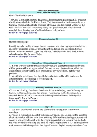 This document provides links to purchase homework help for various business and management courses. Some of the course topics included are operations management, human relationships, committees and teams, technology dominance battles, government contracting, health maintenance organizations, strategic planning, project management, social media, performance management, and pharmaceutical industry analysis. Clicking on the course titles would show the specific homework questions or case studies available for purchase. Services are available without registration and are rated highly.