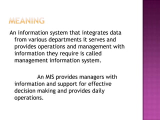 An MIS integrates data from various departments and provides operations and management with required information for decision making and daily operations. The document then provides examples of different types of MIS like financial MIS, marketing MIS, human resources MIS, and manufacturing MIS. It describes the purpose, inputs, and outputs of each system.