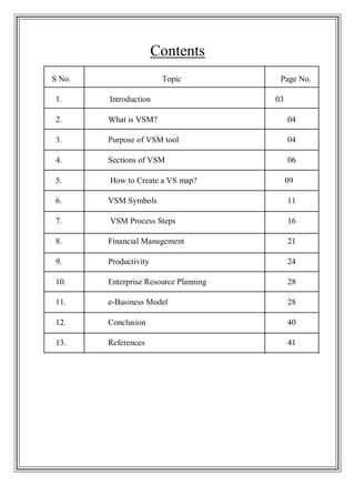 This document provides an overview of value stream mapping (VSM), including its purpose, key sections, symbols, and process. VSM is a tool used to visualize and improve the flow of materials and information in a production process. The document outlines how to create a current state map by gathering data on cycle times and inventory levels. It then explains how to develop a future state map to eliminate waste. The goal is to synchronize production with customer demand and achieve continuous flow.