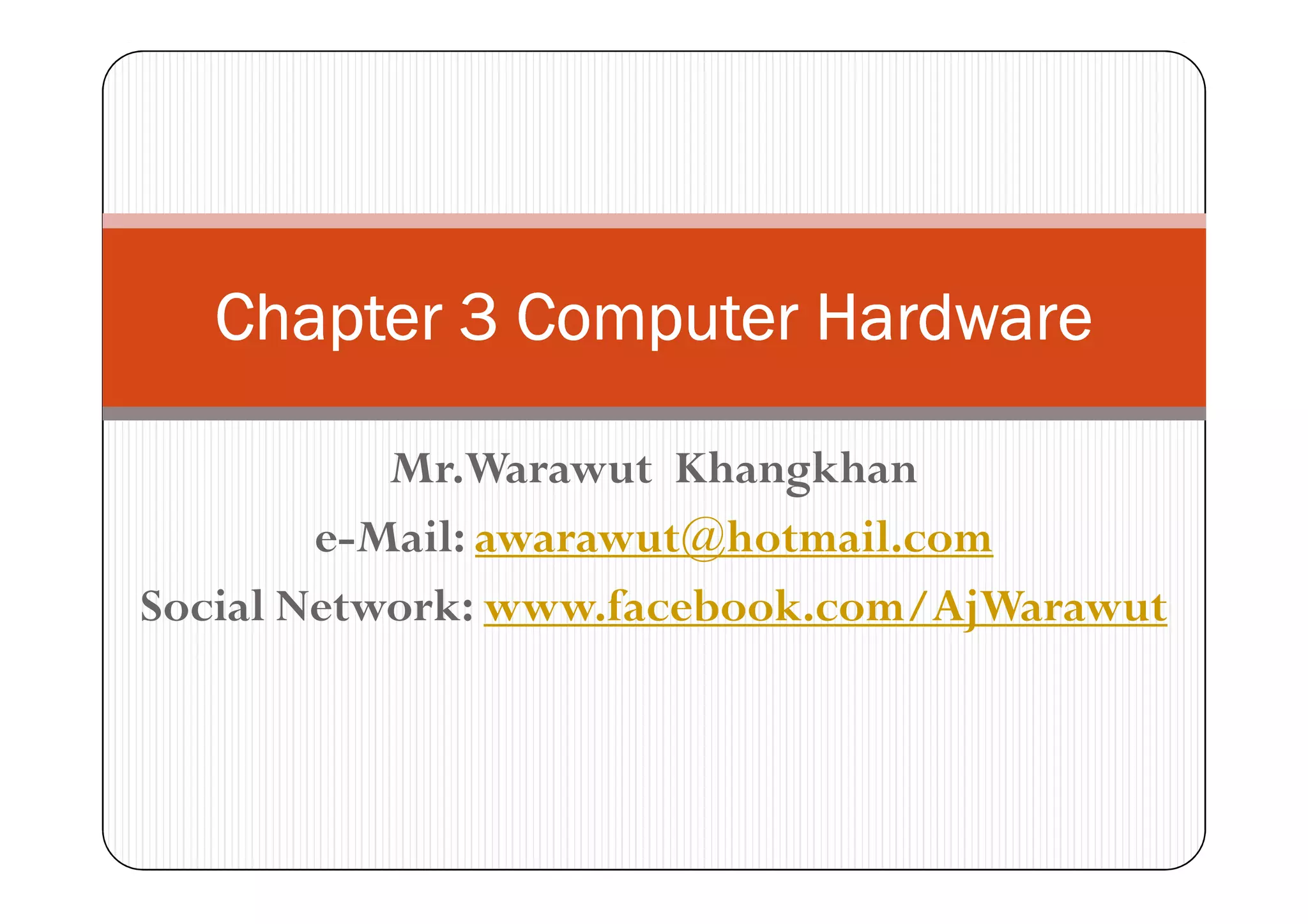 1) The document discusses different types of computer hardware, including supercomputers, mainframe computers, minicomputers, and microcomputers.