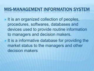 A management information system (MIS) is an organized collection of people, procedures, software, databases, and devices used to provide routine information to managers and decision-makers. MIS was started in the early 1960s using regularly generated scheduled reports on a daily, weekly, and monthly basis. Exception reports were also used to represent unusual events. Now, all reports are merged from different fields to form comprehensive MIS. The objective of MIS is to support operational efficiency, marketing, production, finance, and other areas through common databases and the generation of reports from transaction processing systems. MIS has wide applications in agriculture for pest prediction, helping farmers with price information and product analysis.