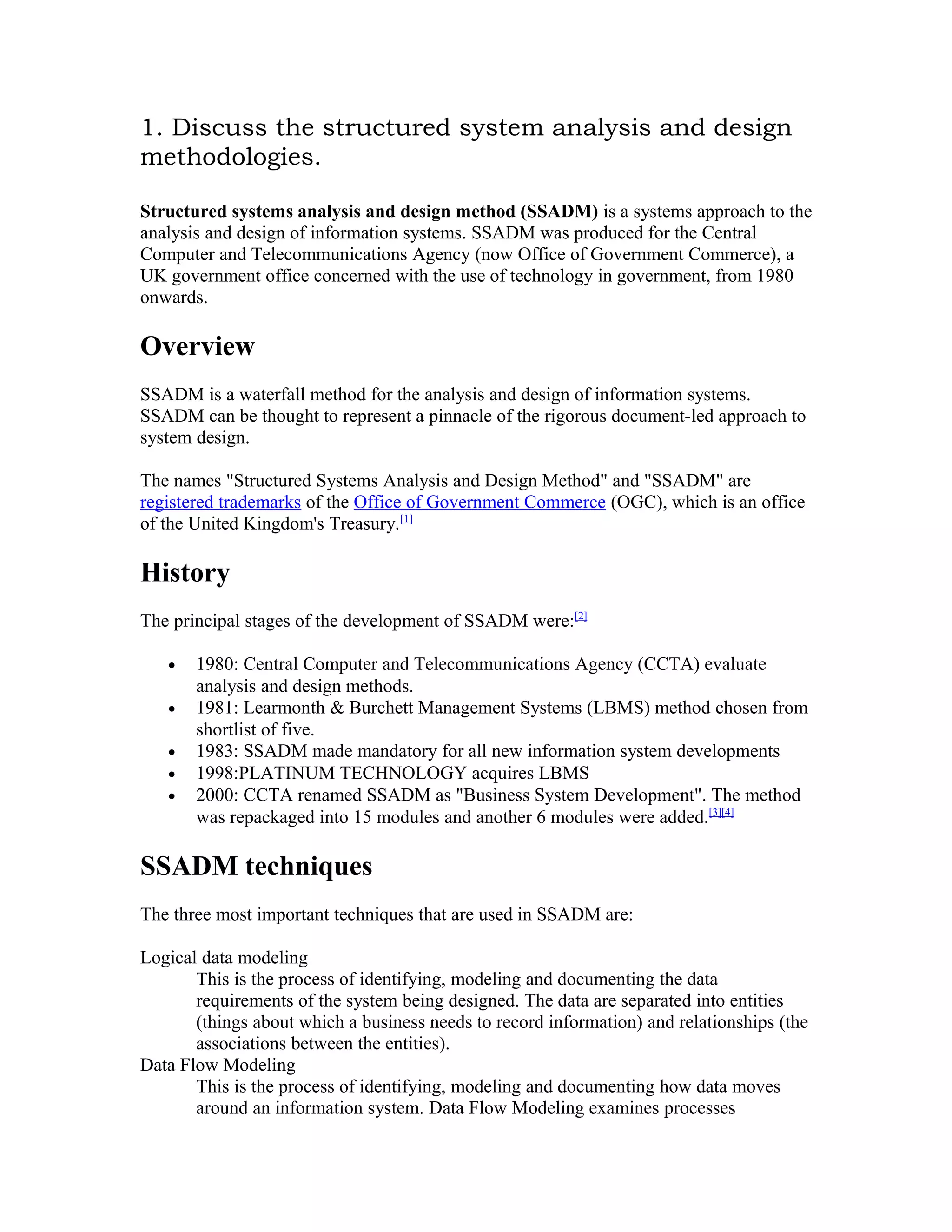 The document details structured systems analysis and design methodologies (SSADM), which is a waterfall method for analyzing and designing information systems, developed by the UK government since 1980. It discusses the five main stages of SSADM, starting from feasibility studies to the physical design of a system, highlighting techniques such as logical data modeling and entity behavior modeling. Additionally, it covers decision support systems (DSS), including their components, evolution, classifications, and the importance of user interfaces in aiding organizational decision-making.
