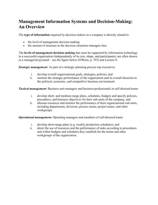 Management Information Systems and Decision-Making: An Overview discusses different types of information systems that support decision-making at various management levels. It describes strategic, tactical, and operational management and the kind of structured, semi-structured, and unstructured decisions made at each level. The document also outlines different types of information systems like Management Information Systems, Decision Support Systems, Executive Information Systems, and Specialized Processing Systems that provide information to managers and professionals. Finally, it notes that real-world information systems typically integrate various types of systems to support multiple management levels and business functions.