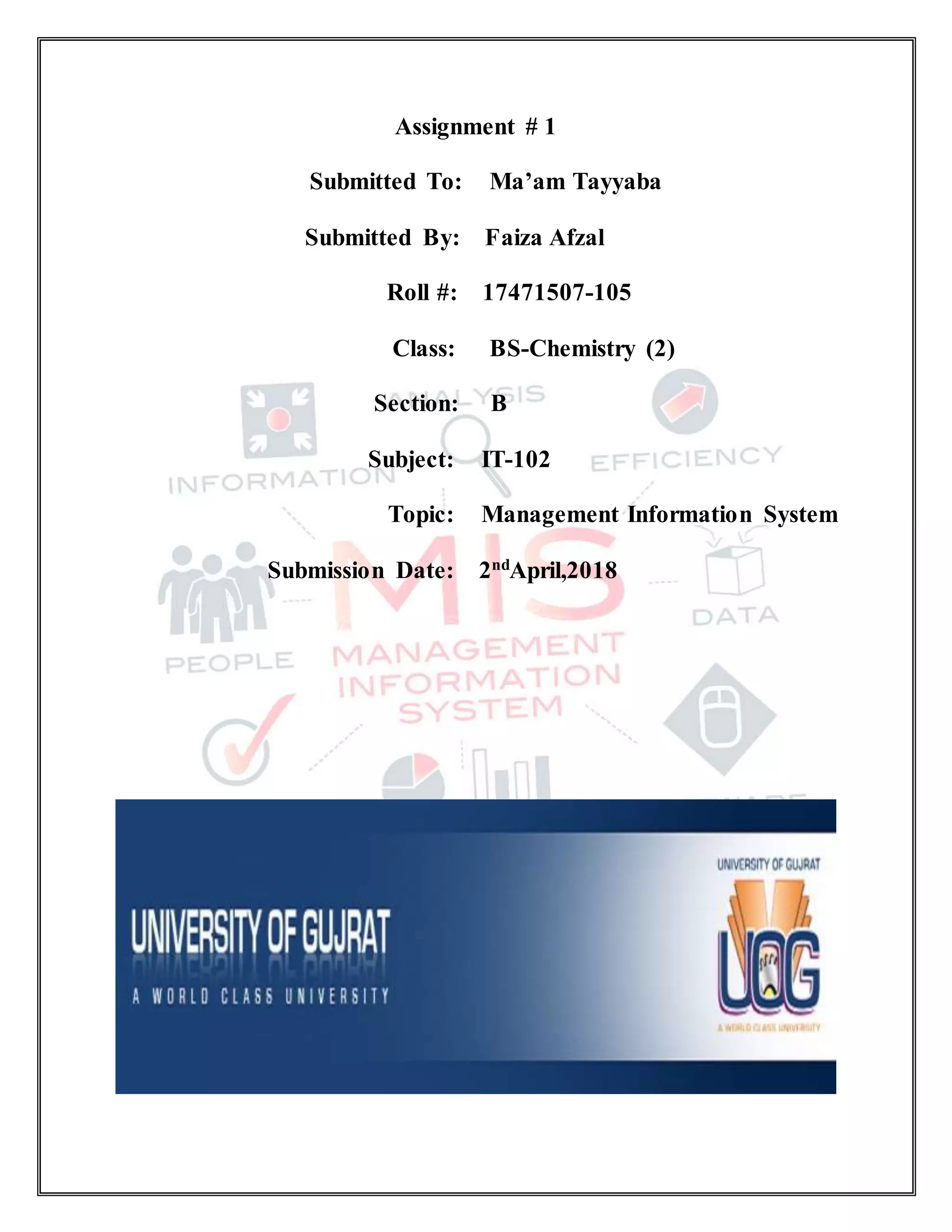 This document is an assignment submission for an IT-102 class on Management Information Systems. It discusses key topics of MIS including the definition, components, inputs and outputs, types and applications, and advantages. Management information systems integrate people, processes, data and technology to provide managers with timely information to support decision making and monitor business performance. They have advantages like improved market monitoring, strategy development, and functional integration across departments.