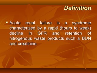 The document discusses the management of acute renal failure (ARF), outlining its definition, etiology, classification, diagnostic approach, and treatment strategies. It details the causes of pre-renal, intrinsic, and post-renal azotemia, along with clinical assessment techniques and laboratory tests necessary for diagnosis. Additionally, it addresses the management of complications and the indications for dialysis, highlighting the overall mortality rate and prognosis for patients with ARF.