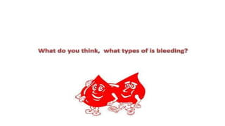 This document provides an overview of the management of bleeding. It defines hemorrhage and classifies it according to source, time of onset, visibility, and mode of onset. Reactionary hemorrhage occurs within 24 hours and secondary hemorrhage occurs 7-14 days later, often due to infection. Management involves controlling external bleeding through pressure, packing, and positioning as well as controlling internal bleeding through fluid resuscitation, operative techniques, and addressing any precipitating factors in reactionary or secondary hemorrhage. The effects of significant blood loss include shock, organ dysfunction, and metabolic derangements.