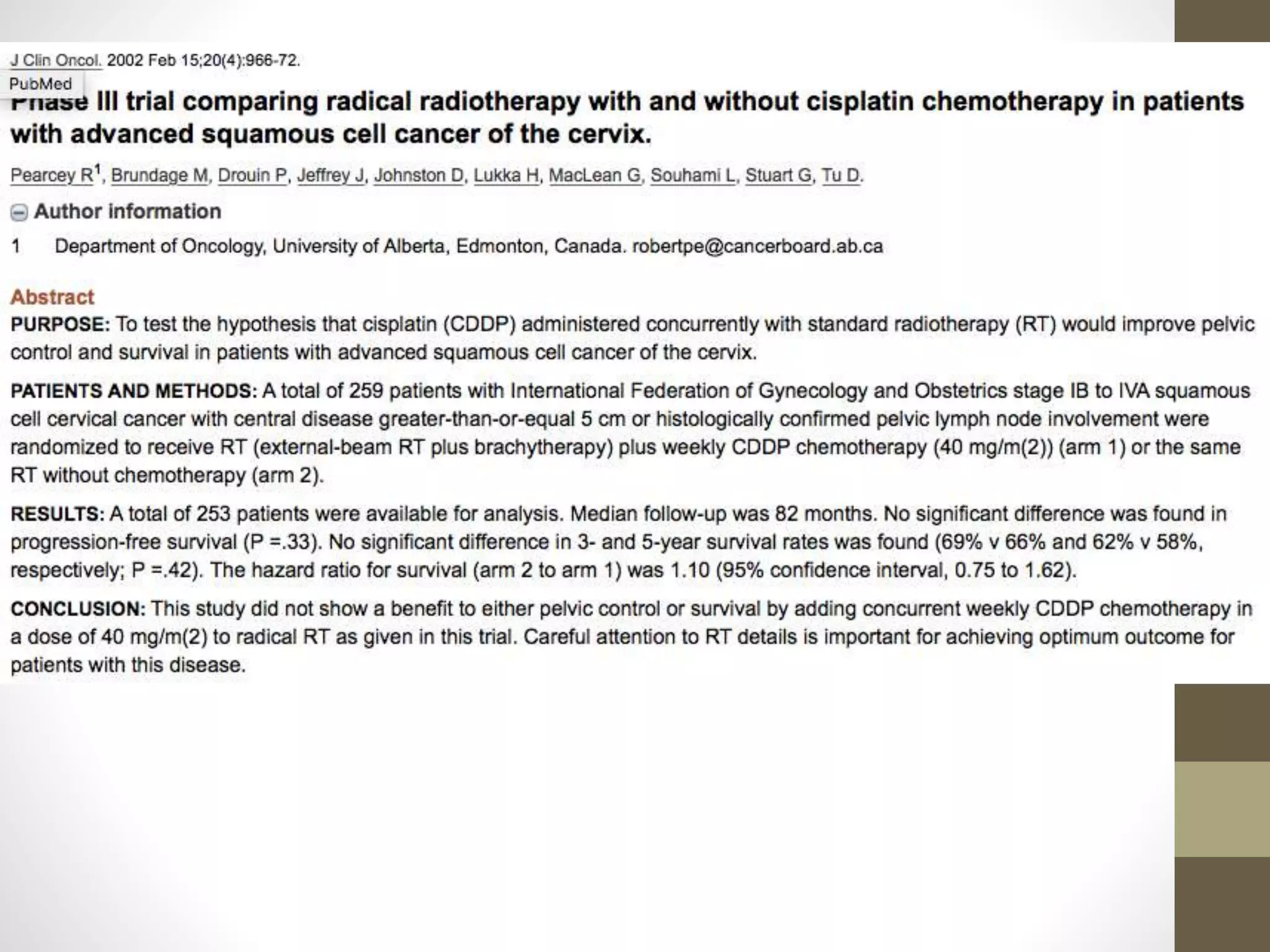 This document summarizes the management of carcinoma of the cervix according to the 2018 FIGO staging system and various medical textbooks. It discusses treatment options for preinvasive disease and early stage cervical cancer (Stage IA-IIA), including conization, loop electrosurgical excision, hysterectomy, and radiotherapy. For more advanced stages (IB3-IVA), the standard of care is described as concurrent chemoradiotherapy with cisplatin. Several landmark clinical trials are summarized that demonstrated improved survival outcomes with the addition of chemotherapy to radiotherapy.