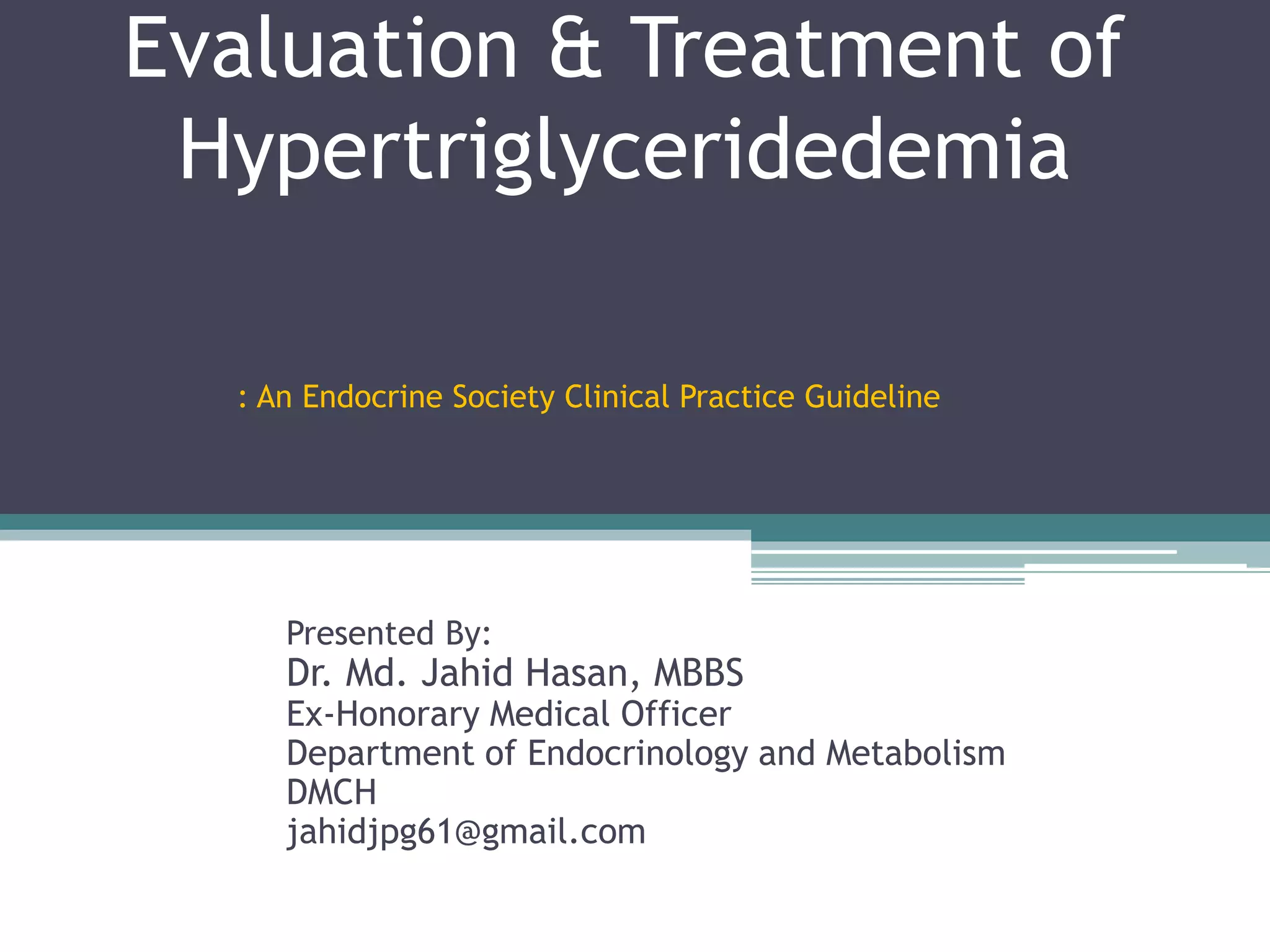 This document provides recommendations for the evaluation and treatment of hypertriglyceridemia. It defines normal triglyceride levels and categories of mild, moderate, severe and very severe hypertriglyceridemia. Primary causes include genetic factors while secondary causes include endocrine diseases, medications and lifestyle factors. Management involves addressing the underlying cause, lifestyle modifications like diet and exercise, and pharmacological treatment including fibrates, niacin, omega-3 fatty acids and statins depending on the severity of hypertriglyceridemia and cardiovascular risk factors. The goal is to lower triglyceride levels and cardiovascular risk through a combination of lifestyle and medical interventions.