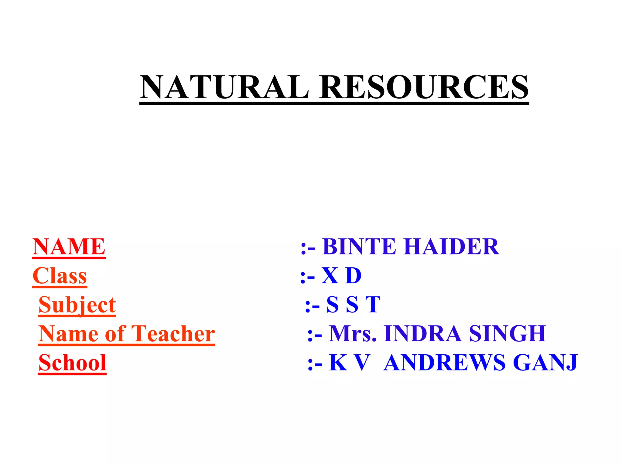 This document discusses natural resources and their management. It covers renewable and non-renewable resources, the 3 R's for environmental conservation, and the need for proper management of resources. Specific sections cover forests, wildlife, water resources including dams and water harvesting, and coal and petroleum. The key points are that natural resources require judicious management to avoid overuse and ensure availability for future generations given population and development pressures.