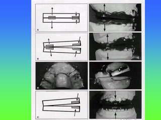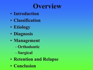 This document provides an overview of the management of open-bite in orthodontics. It discusses the classification, etiology, diagnosis and management of open-bite. Management can involve orthodontic correction using appliances like tongue cribs, activators or myofunctional appliances. Surgical correction through procedures like osteotomies may also be used. For severe cases, a combination of orthodontic and surgical treatment is necessary to fully correct skeletal discrepancies and achieve a functional occlusion.