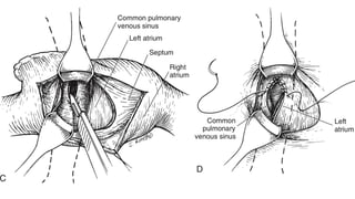 2. Surgical repair is the definitive treatment and involves anastomosis of the pulmonary veins to the left atrium. Factors like age, type of TAPVC, and presence of obstruction determine timing of surgery.
