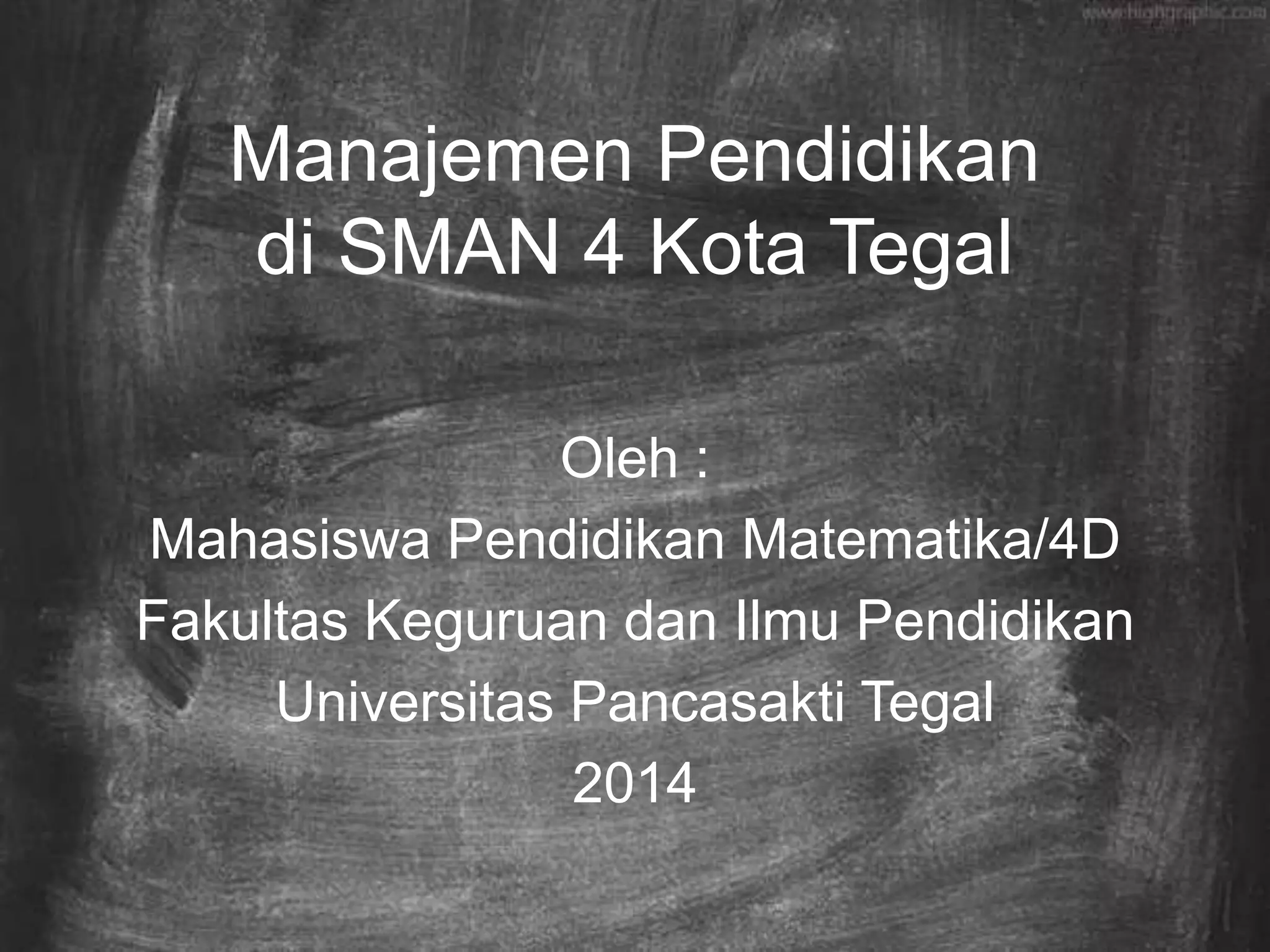 Dokumen ini menjelaskan pentingnya manajemen pendidikan di SMAN 4 Kota Tegal, di mana keberhasilan sekolah dipengaruhi oleh kolaborasi berbagai komponen seperti guru, staf, dan masyarakat. Selain itu, dokumen ini menguraikan berbagai aspek manajemen, termasuk sumber daya manusia, kurikulum, sarana-prasarana, dan pengembangan program unggulan untuk menarik minat peserta didik. Rekomendasi diberikan untuk meningkatkan kesadaran peserta didik dan penguasaan teknologi oleh guru untuk mendukung proses pembelajaran.