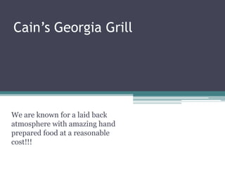 Cain's Georgia Grill is proposing to open a new restaurant in the town of Baxley, Georgia with a population of approximately 5,000 people. The restaurant would be located in a vacant Quizno's building on a major highway with plenty of parking and outdoor seating. The total startup costs are estimated to be $225,000, which will be financed through a $175,000 loan on the building and $2,000 for an outdoor grill. The owners believe the restaurant can be feasible and cover all costs by bringing in $1,200 in sales per day.