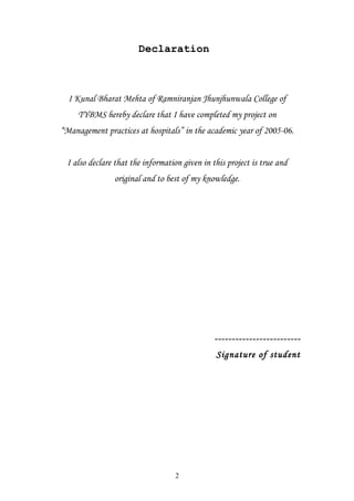 The document is a project report on management practices at hospitals, detailing the author's study and findings on hospital management in India. It provides an overview of the healthcare industry's growth, statistics, and various types of hospitals, while also discussing modern management practices essential for effective hospital operations. Additionally, it includes insights from interviews and personal experiences at specific hospitals to emphasize the complexity and teamwork necessary for successful healthcare delivery.