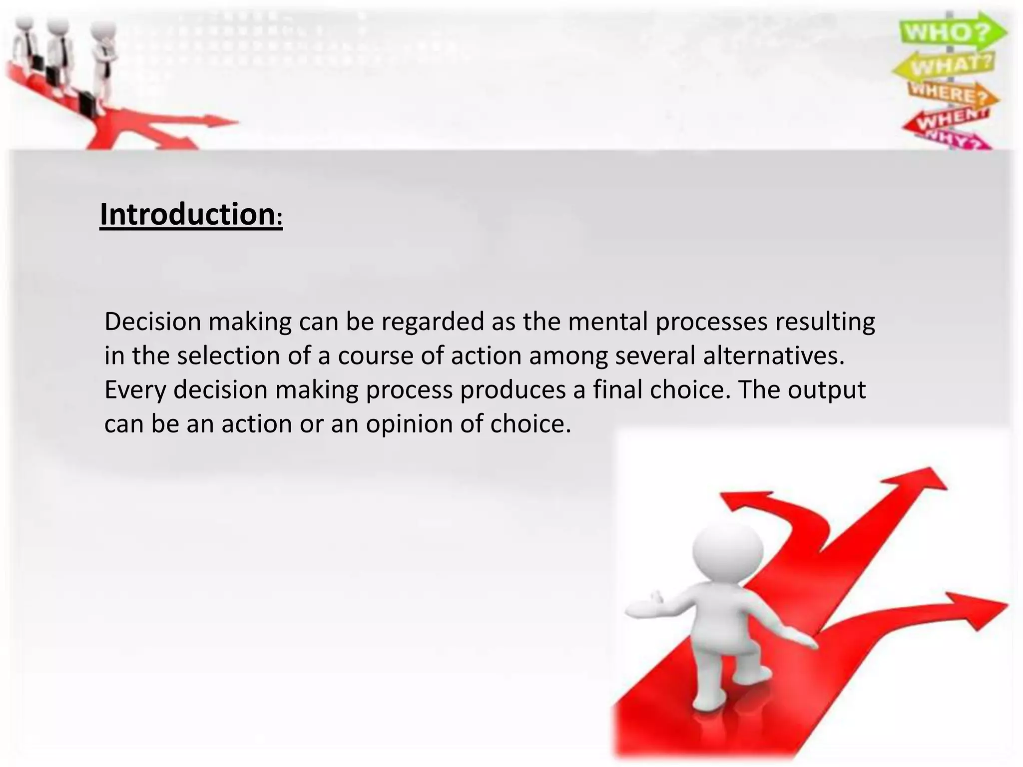 1) The document discusses the steps of the decision making process which includes identifying the problem, criteria, weighting criteria, developing alternatives, analyzing alternatives, selecting the best alternative, implementing it, and evaluating.