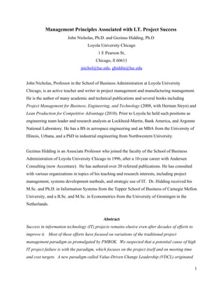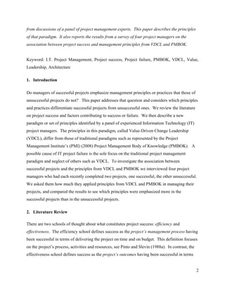 The document discusses the principles of value-driven change leadership (VDCL) in the context of improving success rates in information technology (IT) projects. It contrasts traditional project management paradigms, such as PMBOK, with VDCL and highlights the importance of focusing on project outcomes, stakeholder agreement, and understanding project architecture. Through surveys of project managers, the paper identifies key principles that differentiate successful projects from unsuccessful ones.